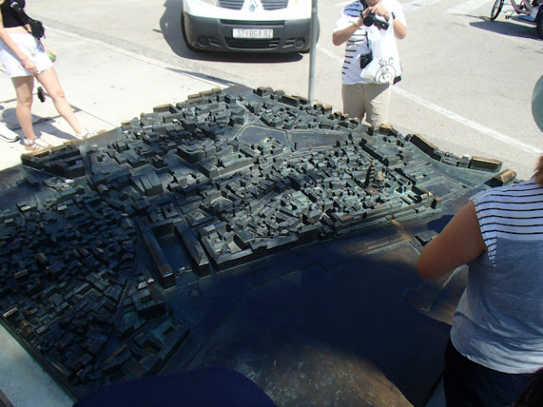 ディオクレティアヌス宮殿入り口近くには宮殿を型取った銅板地図が。真夏なのでこの上で目玉焼き焼けます。