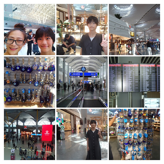 途中のイスタンブールでお土産など見つつ乗り換え時間をつぶしていると、青い眼玉みたいな飾り物?が沢山。とっても綺麗だったので思わず購入しそうになりましたが、いやまてよ。わいは今回イスタンブールに来たわけではないのにイスタンブール土産を買うのはいかがなものか?雑念が入り購入に至らず。写真だけ頂きました。