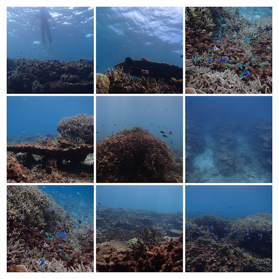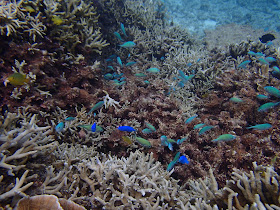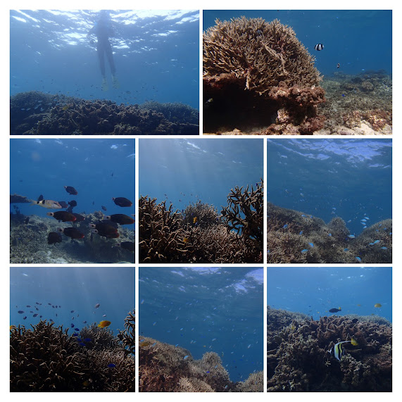 沖はテーブルサンゴ、枝珊瑚が群生し、縦にリーフが並び、魚影も濃く、大満足!餌付けされているのか小魚がうようよ寄ってくる!遠浅でスズメダイの大群がいました。